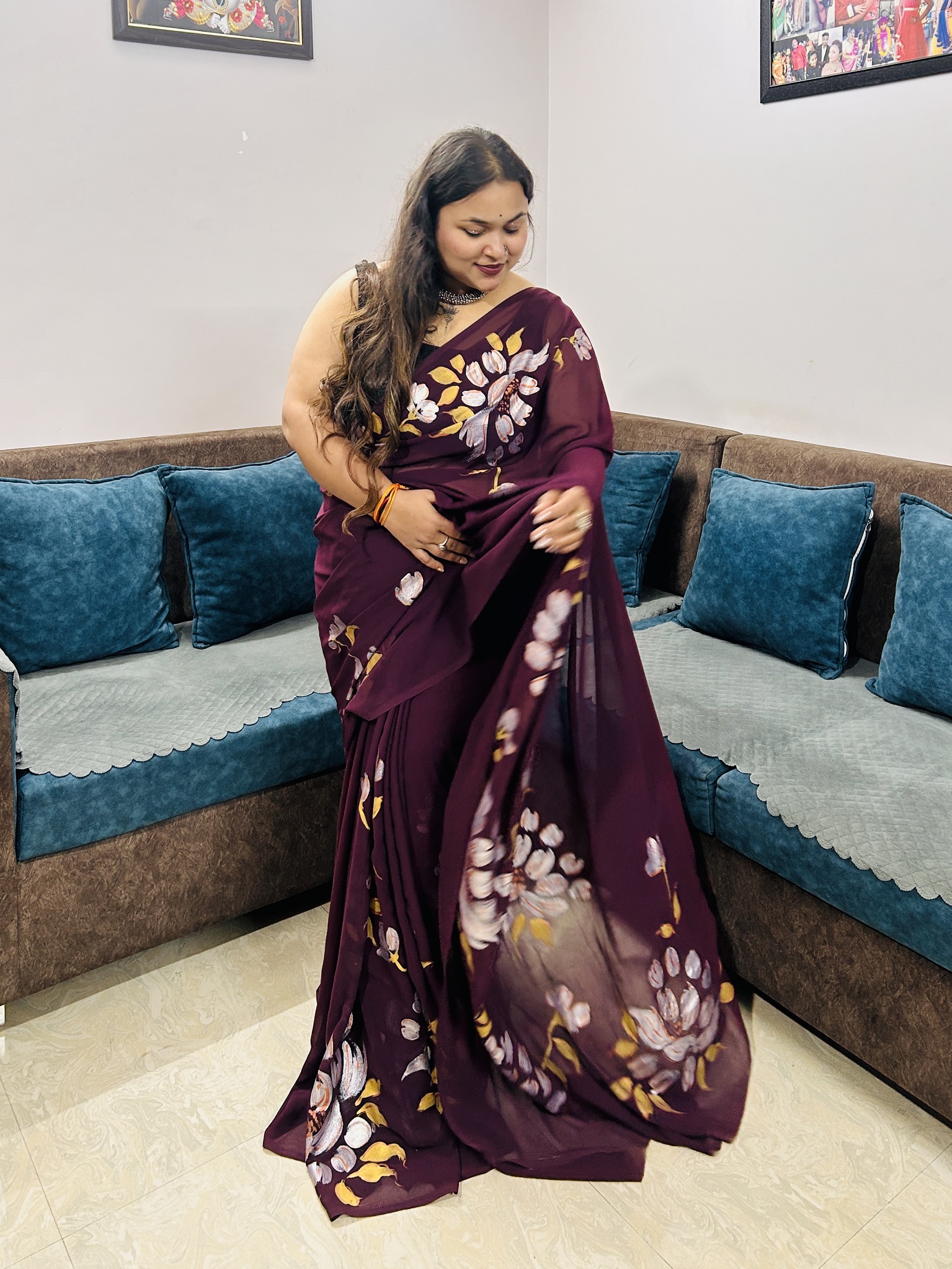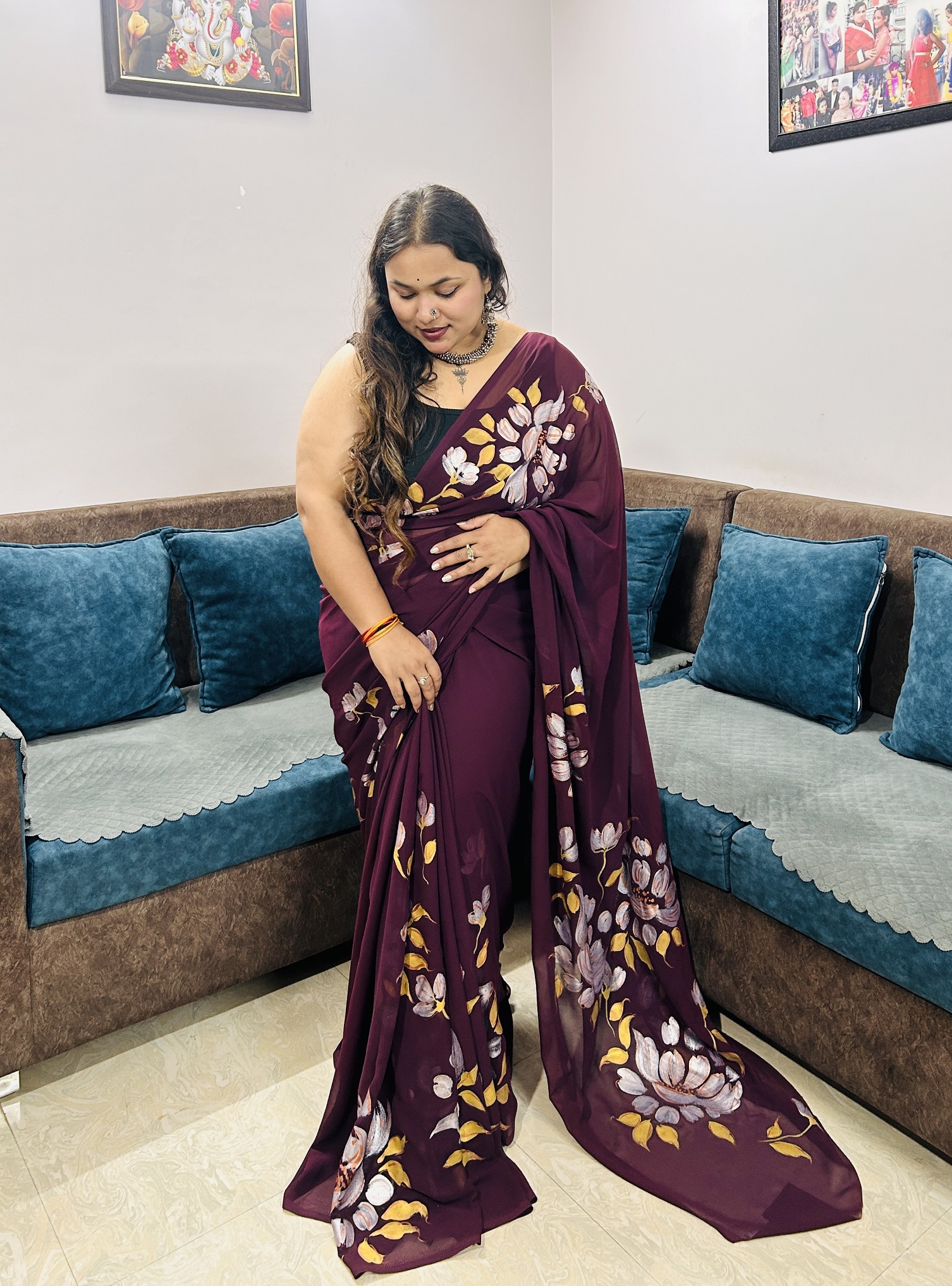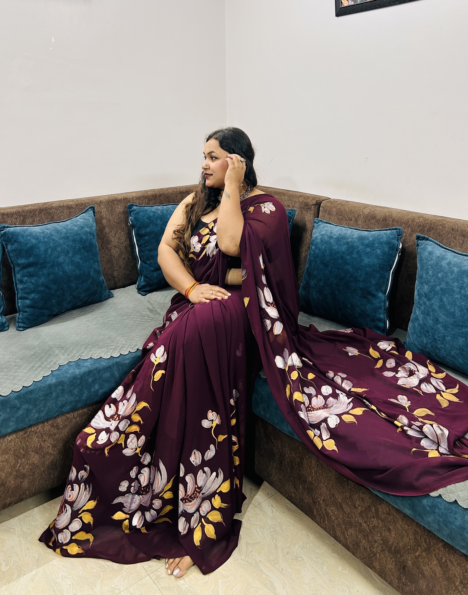 Raagni is where art meets emotion. Draped in a deep wine hue, this saree is adorned with handpainted floral motifs finished in metallic colors, creating a soft, luminous sheen that elevates the design. The metallic florals shimmer subtly with movement, adding richness without overpowering the elegance of the saree. Crafted in a lightweight, fluid fabric, Raagni offers a graceful drape and effortless comfort. Designed for evenings that call for understated glamour, festive moments, and intimate celebrations, Raagni reflects the beauty of handcrafted luxury and timeless style.