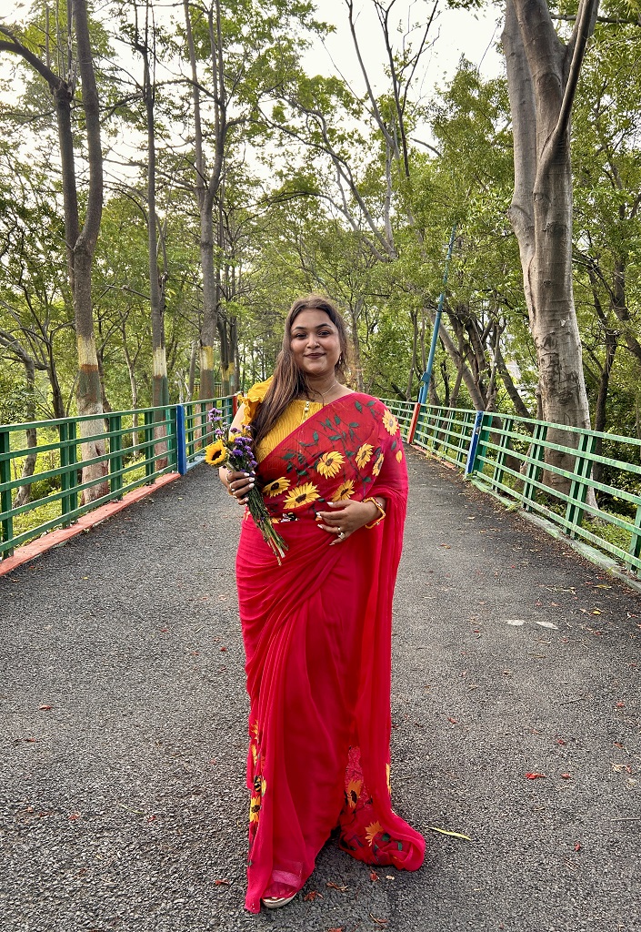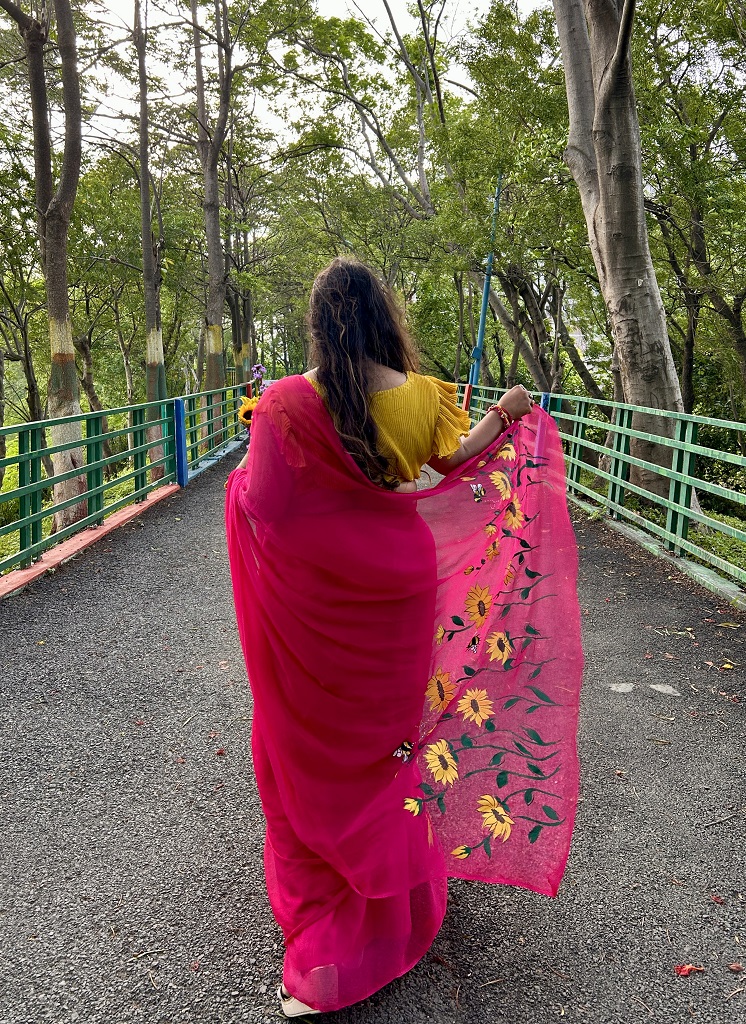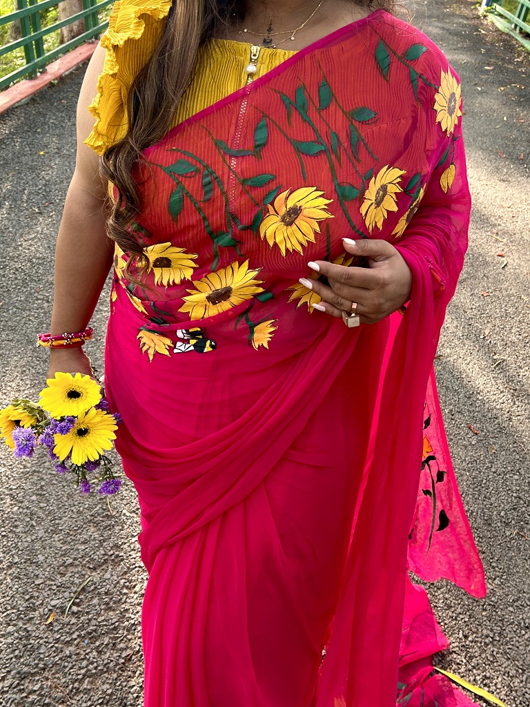 This rani pink saree is full of colour and happiness. The bright sunflower prints make it look fresh and lively, just like a sunny day. Soft honey shades add a warm glow, and the whole look feels sweet and strong — just like a honeybee moving through flowers. It’s a perfect mix of beauty, nature, and confidence.